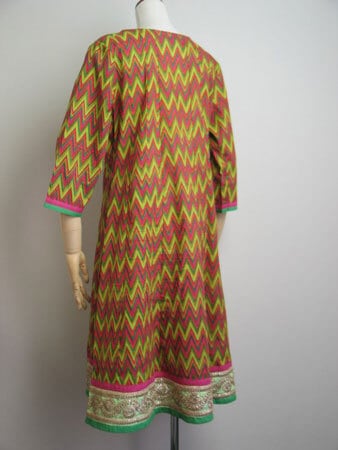 前・後ろ身頃ともに縦に7枚はぎで仕立てたきれいなフィット感もあるフレアライン、色は明るい赤/オレンジ/緑/黄緑などを使った幾何学模様、袖は7分丈ほど。濃いめのピンクとグリーンのラインもかわいいです!
