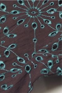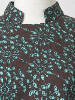 全体的に刺繍の入ったコットン生地を使ったアオザイ風ブラウスです。チョコレートのような茶色にきれいなターコイズ色の刺繍が施されています。
