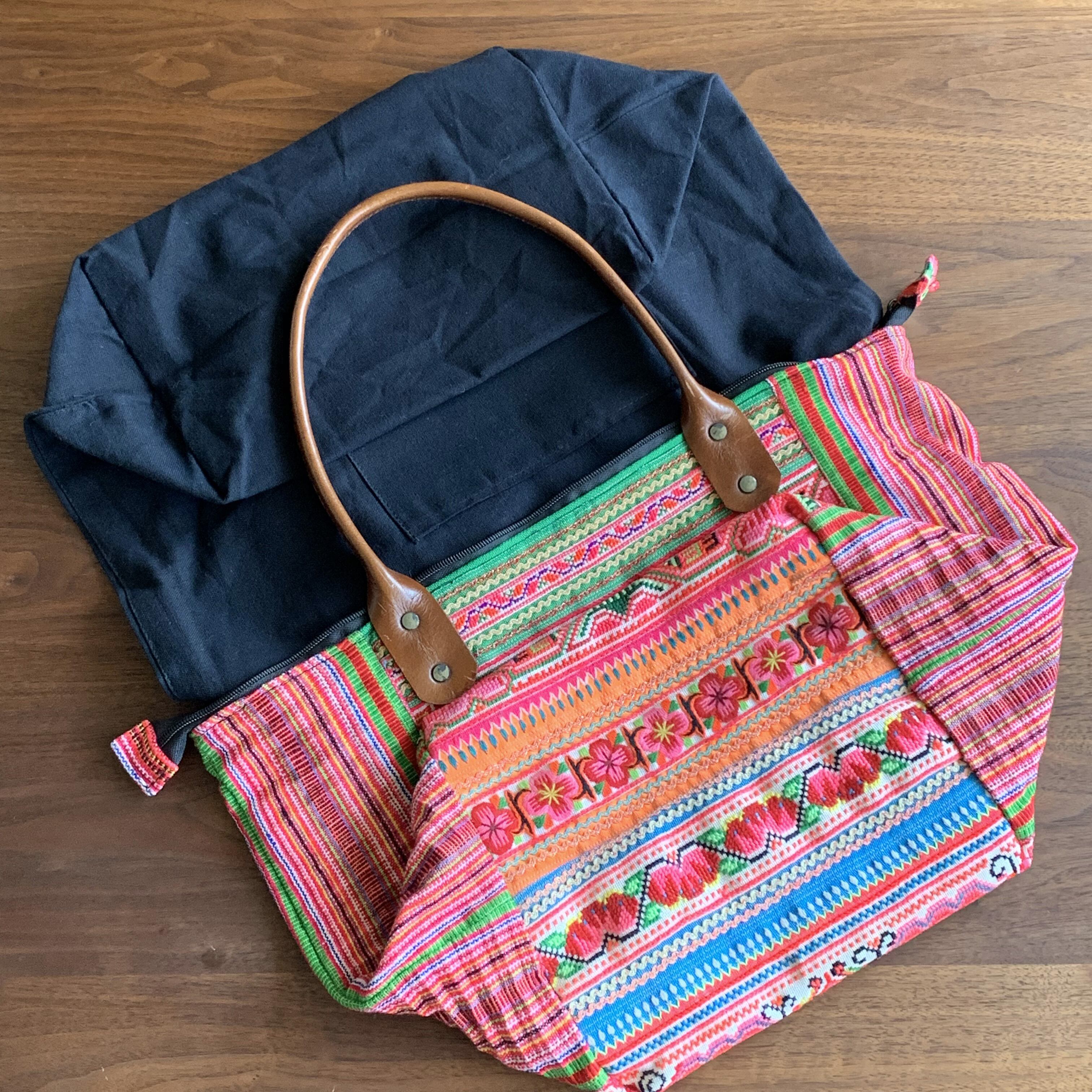 モン族の古布を使ったバック、鮮やかな色合いの刺繍の入った古布はとても美しく貴重なもの。表と裏にそれぞれ別の布を使い底の中心で縫い合わせており、サイドにはストライプ状のカラフルな布が使われています。
