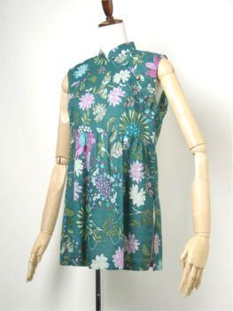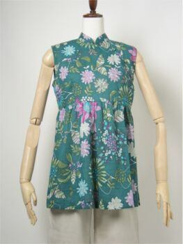 薄手のさらりとしたコットン生地のチャイナ風ノースリーブトップ、明るめのグリーンに大きめの花柄がきれいです。